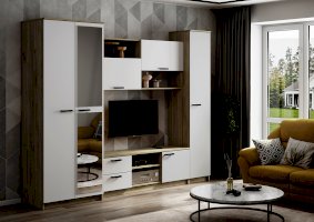 - Гостиная состоит из трёх модулей (шкаф платяной, шкаф бельевой, средняя секция), которые при желании можно устанавливать отдельно друг от друга, размещая в разных комнатах
